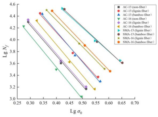(1) the linear decreasing relationship between lgNf and lgσ0 indicates that the fatigue life of plant fiber asphalt mixture decreases with the increase in loading stress. Under the action of fatigue load, internal cracks initiate inside the mixture structure, stress concentration occurs at the initial defects and microcracks expand at a faster rate. The repeated action of the load further expands the cracks and finally leads to structural failure.