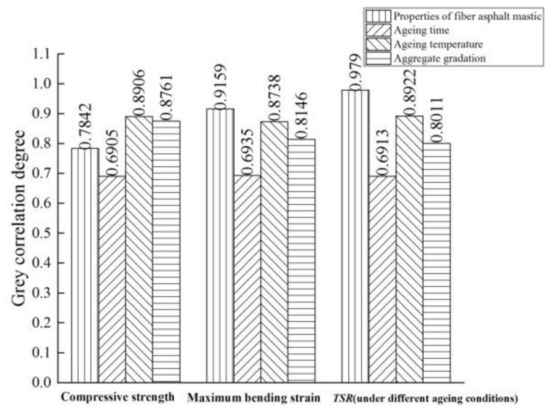 (1) in terms of mechanical properties, the influencing factors of ageing durability are ranked as follows: ageing temperature > aggregate gradation > properties of fiber asphalt mastic > ageing time. The correlation between ageing temperature and compressive strength is 0.8906, indicating that ageing temperature has the greatest influence on the mechanical ageing durability of asphalt mixture. The increase in ageing temperature intensifies the molecular activities and oxidation degree of asphalt in the ageing process, accelerates the ageing of asphalt mixture, and the mechanical properties of asphalt mixture gradually change from elastic to viscous. The bonding force between asphalt and aggregate weakens, the asphalt mixture gradually becomes soft, and the compressive strength and compressive resilient modulus decrease [39]. The correlation between aggregate gradation and compressive strength is 0.8761, which is the second major factor. The skeleton-type coarse aggregate content and asphalt content of asphalt mixture have important effects on its mechanical ageing durability.