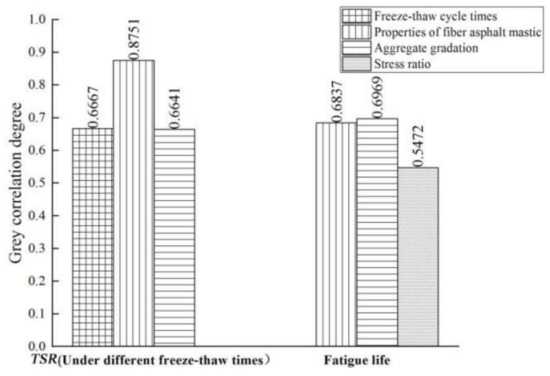 (2) the influencing factors of freeze-thaw cycle durability of asphalt mixture are ranked as follows: properties of fiber asphalt mastic > freeze-thaw cycle times > aggregate gradation. The correlation between properties of fiber asphalt mastic and TSR value is 0.8279, which is the most major factor affecting the durability of freeze-thaw cycle. The freeze-thaw cycle failure of asphalt mixture is a process in which under the action of moisture and temperature, the bonding property of the interface between asphalt and aggregate is decreased, the structure of the material itself is destroyed, and the internal damage is gradually accumulated. The addition of fiber can effectively improve the viscosity and consistency of asphalt mastic, and the adsorption of fiber on asphalt enhances the freeze–thaw damage resistance of asphalt mixture.