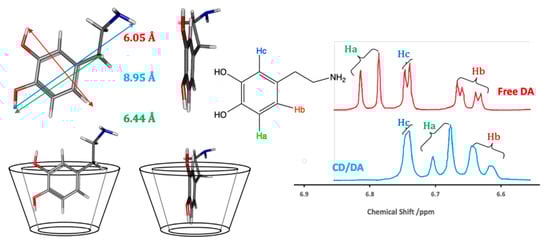 Although there is no single simple theory that can be used to describe the binding between the CD host and the guest molecule in solution, there is a general consensus that hydrophobic and van der Waals interactions are important in the formation of the inclusion complex [23,24,25]. In this case, the hydrophobic sites on the guest molecule are included within the hydrophobic cavity of the CD. Dipole-dipole, hydrogen bonding, and charge-transfer interactions have also been discussed for some guest molecules [25], illustrating the relevance of the properties of the guests, while the exclusion of cavity-bound high-energy water and conformational strain are also relevant factors [24]. Another important consideration is the size of the guest molecule, or the size of the hydrophobic component of the guest, compared to the internal diameter of the CD [23]. An illustration of this inclusion formation is given in Figure 2, where dopamine is considered as the guest molecule. The dimensions of dopamine indicate that it can form a host–guest complex with β-CD. The corresponding 1H NMR spectra of the aromatic region of dopamine show that not all the protons are affected in the same manner by the presence of the β-CD. There is a significant shift in Ha, a smaller shift in Hb and no observable change in Hc, suggesting that Hc remains outside the cavity.