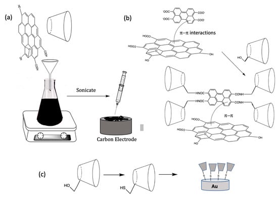 The noncovalent methodologies used to form the rGO/CD-based sensors are generally very simple and can be carried out with no significant chemical modifications. Typically, GO is dispersed in solution and then mixed with the CDs, to form stable aqueous dispersions, and drop cast onto a carbon-based electrode, such as glassy carbon [34], screen printed electrodes [45], or fabricated as carbon paste electrodes [46,47,48]. The GO/CD can then be reduced chemically using reducing agents, such as hydrazine [44,45], or the more environmentally acceptable ascorbic acid [49] to give rGO/CD. Alternatively, the GO/CD can be electrochemically reduced by cycling the applied potential to values in the vicinity of −1.4 V vs. SCE (saturated calomel electrode) [21]. In some studies, the GO is reduced initially to form rGO, which is then combined with the CD [50], while the CD has also been immobilized onto the rGO modified glassy carbon electrode by simple immersion in the CD solution for about 5 h [51]. These simple methodologies are illustrated and summarized in the schematic provided in Figure 4a.