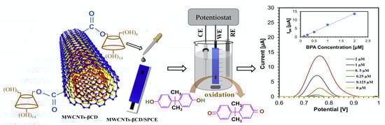CD-linked multiwalled carbon nanotubes (MWCNTs-βCD) deposited onto screen printed electrodes (SPCE) and employed in the detection of Bisphenol A. Reproduced with permission from Ali et al. [92], Sens. Actuators B Chem.; published by Elsevier, 2020.