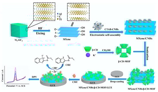 Synthetic route of the MXene/CNHs/β-CD-MOFs and the sensing strategy for carbendazim. Bulk Ti3AlC2 is etched and exfoliated, then combined with carbon nanohorns (CNHs), decorated with β-CD-MOF and drop casted onto a glassy carbon electrode (GCE). Reproduced with permission from Tu et al. [154], J. Hazard. Mater.; published by Elsevier, 2020.