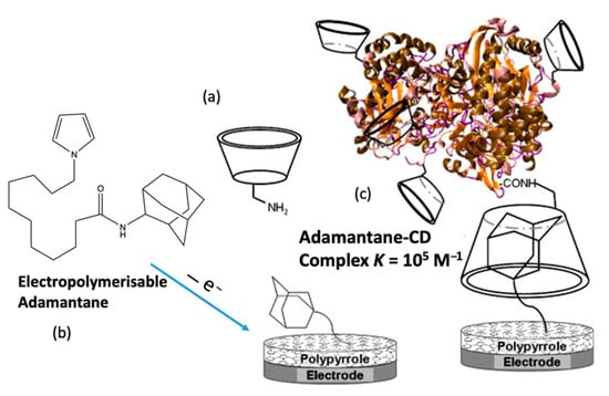 It is well established that electrochemical-based biosensors can be constructed using molecular recognition elements, such as proteins, enzymes, and more recently aptamers. However, there is also clear evidence that the addition of cyclodextrins can lead to a further improvement in the sensitivity and selectivity of biosensors. This supramolecular-centered approach can be employed to increase the loading of the enzyme/protein. Moreover, the CD has a hydrophobic cavity, providing an ideal microenvironment for the enzyme. Among the extensive range of host–guest complexes, the adamantane–β-CD inclusion complex [160] is especially useful in the design of electrochemical-based biosensors [161,162]. The CD adamantane host–guest complex serves to dock the biological recognition element of the sensor, facilitating its recognition of the target analyte. Coupling is normally achieved with adamantane carboxylic acid [163,164], but in addition, adamantane derivatives can be used. For example, an adamantane-pyrrole derivative has been employed as an affinity binding polymer [119] and pyrene-adamantane was used to form a biosensor for the detection of glucose [165]. This strategy is summarized in Figure 8, where pyrrole is coupled to adamantane, facilitating the deposition of a polypyrrole film with free adamantane that can form an inclusion complex with the CD. This in turn captures the β-CD tagged glucose oxidase (GOX), anchoring it to the electrode surface.