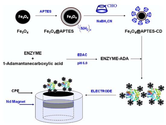 Other additives have been combined with the CDs, and graphene is a good option, as it provides good conductivity with high surface areas. This combined with the CD host-guest interactions gives rise to high loadings of the biological recognition agent. This approach has been utilized in the development of an immunosensor for the detection of carcino-embryonic antigen (CEA), an important biological marker of colorectal adenocarcinoma [168]. Likewise, carbon nanotubes have been integrated into the supramolecular biosensors due to their high electrocatalytic properties and employed in the detection of organophosphates [169] and glucose [119]. Moreover, gold [170], platinum [171,172], and silver [173] nanoparticles have been added to enhance the rate of the electron-transfer reaction. Likewise, enzyme-loaded nanoparticles have been magnetically immobilized in the fabrication of biosensors for xanthine and catechol detection [161] and this strategy is illustrated in Figure 9. The magnetic nanoparticles are functionalized with amine groups and then coupled with the CDs through the reaction of the NH2 and CHO groups, combined with the enzyme and cast onto a magnetic substrate.