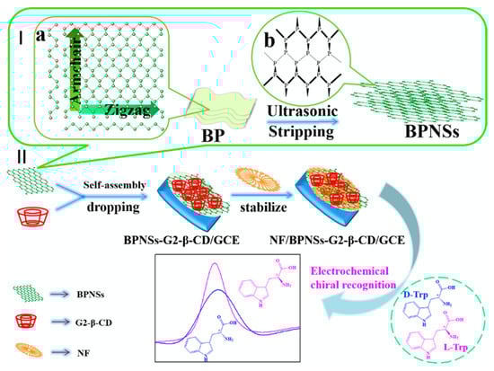 Schematic representation of the liquid-phase exfoliation of (a) black phosphorus (BP) to give (b) nanosheets of black phosphorus (BPNSs), shown in I, and fabrication of a Nafion (NF) BPNSs/β-CD modified electrode and its application in the electrochemical recognition of tryptophan enantiomers shown in II. Reproduced with permission from Zou and Yu [184], Mater. Sci. Eng. C; published by Elsevier, 2020.