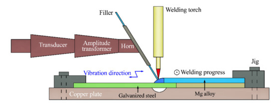 However, the way to ameliorate the performance of steel/Mg joints through a metal intermediate layer has reached a bottleneck. For example, it was difficult to eliminate the structural defects, such as coarse grains and pores, on the Mg alloy side of the joint with a traditional welding process. In comparison with other welding techniques, ultrasonic vibration-aided welding is an emerging welding technology with advantages of high efficiency and low energy consumption [14,15]. Liu et al. [16] studied the influence of ultrasonic vibration on welding the residual stress, micro-hardness, and microscopic characteristics of Q345 steel weld. The results showed that the conventional weld of Q345 steel has a distinct micro-hardness gradient and columnar grains, while ultrasonic impact-treated weld was characterized by a uniform micro-hardness and equiaxed grains [16]. Hu et al. [17] reported the influences of ultrasonic treatment on elevated-temperature tensile strength and the microstructure evolution of hot-extruded Mg–6Al–0.8Zn–2.0Sm wrought Mg alloy. The experimental results revealed that the morphology of Al2Sm phase was fine granular after ultrasonic vibration treatment. In addition, the maximum pressure induced by the collapse of cavitation bubbles was much greater than the shear strength of Al2Sm phase, which caused the rough petal-like Al2Sm phase to split into fine polygonal granules [17]. Wang et al. [18] introduced ultrasonic vibration into an underwater flux-cored arc welding process. According to Wang, ultrasonic vibration can affect the size and morphology of austenite grains during the solidification of the weld pool and ultimately promote the formation of a large number of fine ferrite structures in the subsequent solid phase transformation of the weld metal. In addition, ultrasonic vibration made the columnar structure of the welded metal more refined, achieving a good balance of high tensile strength and impact toughness.