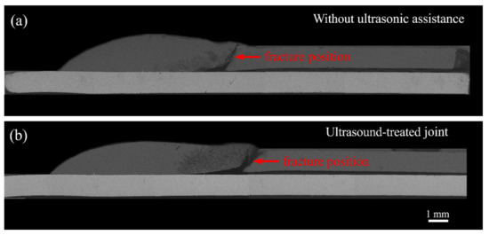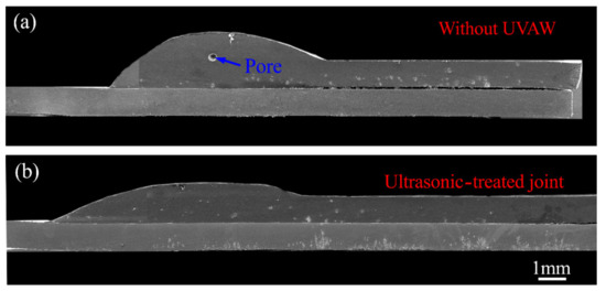 The typical cross-sectional area of weldments obtained with and without UVAW: (a) current of 65 A, ultrasonic power of 0 kW; (b) current of 65 A, ultrasonic power of 0.9 kW.