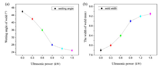 (a) The wetting angle and (b) width of weld under the assistance of varying ultrasonic power.