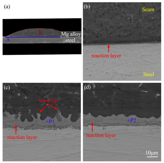 Figure 6b–d show the corresponding BSE micrographs of the brazing area labeled as A, which were welded with and without the assistance of ultrasonic vibration. Under a current of 55 A, a uniform and continuous flake-like reaction layer, with a thickness of about 2 µm, was formed in the interfacial area, as presented in Figure 6b. No crack defects were observed due to the direct contact between the steel substrate and the interfacial reaction layer. Under a current of 65 A, a corrugated reaction layer was formed in the interface area, as shown in Figure 6c. It is obvious that the increase in heat input changed the morphology of the reaction layer and increased its thickness. This was mainly due to the enhanced heat input that can cause the upward volatilization trend of the molten galvanized layer in the molten pool, which caused the undulation of the brazing layer. On the other hand, the increase in the welding heat input increased the bath temperature and enhanced the atomic activity in the interface area, which was conducive to the interface reaction. Therefore, the morphology of the reaction layer in the brazing area was changed, as described above. Figure 6d shows the BSE micrograph of the brazing zone of the weld with the assistance of the UVAW process. By comparing Figure 6c with Figure 6d, it can be seen that the application of the ultrasonic treatment had a certain impact on the morphology of the reaction layer. The main manifestation was that the wave-like morphology of the reaction layer was weakened and the wave tip disappeared. During the ultrasonic vibration aid welding process, the application of the UVAW process played a role in stirring the molten bath, which made the temperature and composition of the molten pool uniform, and finally, inhibited the formation of a wave-like reaction layer. To identify the phase components of the interfacial reaction layer in the brazing area, EDS was carried out and the results show that phases P1 and P2 mainly contained 71.6 wt.% pct Zn, 28.4 wt.% pct Mg and 70.8 wt.% pct Zn, 29.2 wt.% pct Mg, respectively. It was suggested that both phase P1 and P2 were MgZn, which indicates that the UVAW process only changed the morphology of the reaction layer but had no influence on the phase composition.