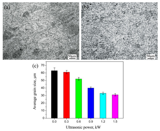 The metallographic microstructure of the fusion welding area: (a) ultrasonic power of 0 kW; (b) ultrasonic power of 0.9 kW, and (c) the crystallite dimension of the weld zone treated with varying ultrasonic power.