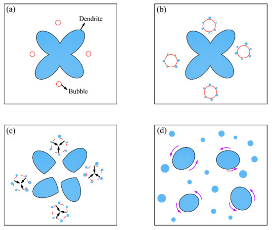 Figure 8 illustrates the refinement mechanism of the UVAW process on the microstructure of the weld zone. The literature reveals that the ultrasonic cavitation and acoustic streaming caused by ultrasonic treatment account for the refinement of coarsening grain in the fusion welding zone. As presented in Figure 8a, a large number of cavitation bubbles were generated in the negative half cycle of the ultrasonic sine wave. Then, the cavitation bubbles absorbed the heat around them and grew up rapidly, resulting in supercooling in the vicinity and thus, forming a mass of nuclei, as illustrated in Figure 8b. When the cavitation bubble grew to the threshold value, it burst and produced a shock wave of gigapascal, thus breaking the growing dendrites, as shown in Figure 8c. Therefore, both undercooled nucleation and broken dendrite can improve the nucleation rate and refine the microstructure of the fusion zone. In addition, during the process of ultrasonic vibration propagation in the weld zone, the sound pressure gradient caused by viscosity attenuation made the liquid metal flow. Under the action of acoustic streaming, the supercooled nucleation points and broken dendrites were evenly transported to various areas of the molten pool. In addition, the acoustic flow accelerated the uniform distribution of elements and alleviated the enrichment of solute at the solidification front, which eventually promoted the spheroidization of α-Mg grains, as shown in Figure 8d.