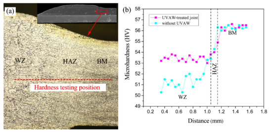 (a) The cross-sectional microhardness test point and (b) the microhardness curves of the galvanized steel/AZ31B joints obtained with and without UVAW.
