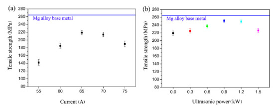 Figure 10 illustrates the tensile strength of the Mg alloy base metal, untreated and ultrasound-treated galvanized steel/Mg alloy joints. For the galvanized steel/Mg alloy joints without the UVAW process, the increase in welding heat input promoted the full progress of the metallurgical interface reaction, thereby improving the welding strength. Under the optimum welding current of 65 A, the maximum strength of the weldment reached 219 MPa, which was 83% of the base metal of the Mg alloy. After the ultrasound treatment, the maximum tensile strength of the galvanized steel/AZ31B weldment was 251 ± 4.1 MPa. Compared with the traditional TIG welded galvanized steel/AZ31B joint, the welding strength was increased by 14.6%. In addition, compared to the application of vibration to the welding platform, the process of applying ultrasonic vibration to the welding wire in this study required less ultrasonic power. The increase of the weld mechanical properties was mainly attributed to the microstructure refinement and defect elimination, as mentioned above. Nevertheless, the mechanical properties of the weldment were slightly reduced as the ultrasonic power increased to 1.5 kW.