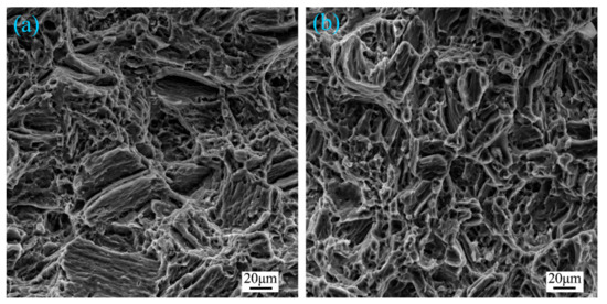Figure 12 and Figure 13 present the typical failure features of untreated and ultrasound-treated galvanized steel/Mg alloy joints. For the untreated joint, the fracture path ran through the welding zone, and the whole fracture was mainly composed of a large-scale cleavage surface and cleavage step, as shown in Figure 12a and Figure 13a. For the ultrasonic-treated joint, the fracture occurred at the edge of the fusion welding zone. It can be seen that the number of cleavage platforms of the fracture surface was fewer than that of the untreated joint and a few dimples were formed. It can be concluded that the fracture mechanism of the joint changed from a cleavage fracture to a mixed fracture of cleavage fracture and dimple fracture under the action of ultrasonic vibration.