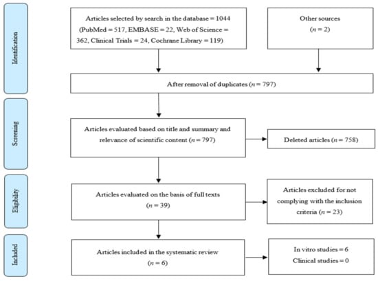 A total of 1044 studies were identified through the search in the referred databases. After the removal of duplicates, a total of 797 articles were obtained, of which 39 were selected after reading the titles and abstracts. The full-text reading led to the exclusion of 23 articles when submitted to the inclusion and exclusion criteria. Two articles were included after analysis of the reference lists of the selected studies. No clinical studies were identified. Six in vitro studies were considered for analysis (Table 3).