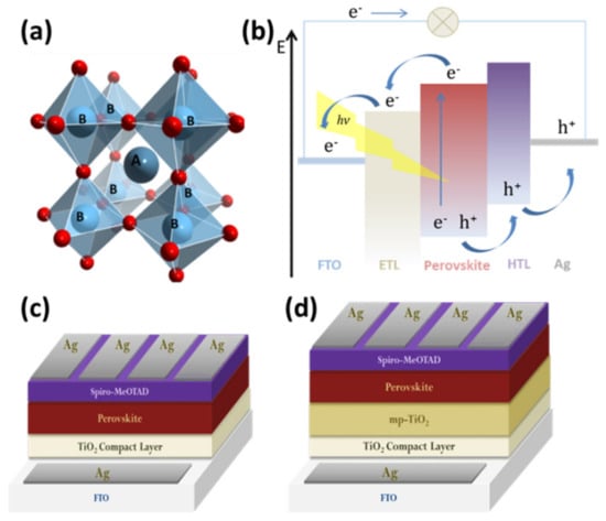 The PSC’s working mechanism includes the absorption of photons [67] from the absorber/perovskite and the transfer and extraction of charge carriers to the respective electrodes. Specifically, photons’ absorption is followed by the presence of excited electrons in the conduction band and holes in the valence band of the perovskite. The electrons are injected into ETL and migrate to the anode. Subsequently, the electron passes through the external circuit to the cathode. At the same time, the holes are transferred through the hole transport layer (HTL) and migrate to the cathode, where electrons and holes recombine (Figure 2b). Charge carrier extraction occurs at the perovskite/ETL and perovskite/HTL interfaces and, then, at the ETL/anode and HTL/cathode interfaces. Thus, the overall photovoltaic performance of PSCs is greatly affected by the properties of these interfaces. Two types of PSC device architectures exist, depending on the ETL and HTL ordering. The case of the ETL, which is an n-type semiconductor, being placed before the perovskite and the HTL, which is a p-type semiconductor, after perovskite attributes to the n–i–p structure, while the opposite attributes to the p–i–n structure [68,69,70]. In the case of the n-i-p type PSCs, planar [71,72] or mesoporous [14,73] configurations can be distinguished, depending on the morphology of the ETL material (Figure 2c,d). Nevertheless, in addition to the perovskite absorber deposited on the ETL, a complete PSC device also comprises the electron collection substrate, usually a conducting oxide glass such as fluorine-doped tin oxide (FTO) or indium tin oxide (ITO) and the hole transporting layer (HTL) in contact with a metallic (Au, Ag) or carbon upper electrode [74,75].