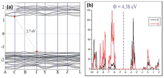 (a) g-C3N4 band structure from density of states (DOS) calculations and (b) analysis of partial density of states (PDOS) comprising C and N orbitals. Reproduced with permission from [42], Copyright 2018, Elsevier.