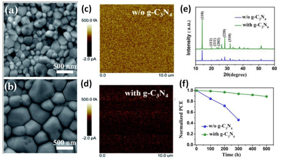 In the few past years many studies have focused on the incorporation of g-C3N4 into the perovskite layer as a passivation strategy for the improvement of the crystallinity, which is a complicated process, the conductivity and, thus, the overall performance of the devices. Towards this strategy, the work from Liao et al. [96] refers to the incorporation of a small amount of g-C3N4 derived by standard pyrolysis of dicyandiamide, into the perovskite ink, which revealed impressive PCEs up to 21.1%. The addition of g-C3N4 led to compact perovskite films with passivated defects, large grain sizes, improved conductivity, and high crystallinity (Figure 5a–e), as confirmed by SEM, FTIR, XPS, and c-AFM measurements, which led to devices with considerably low charge recombination rate. The g-C3N4 modified PSCs are characterized by extremely low hysteresis accompanied by enhanced stability. In fact, after 500 h continuous illumination under one sun, only about 10% decline in devices PCE was observed (Figure 5f).