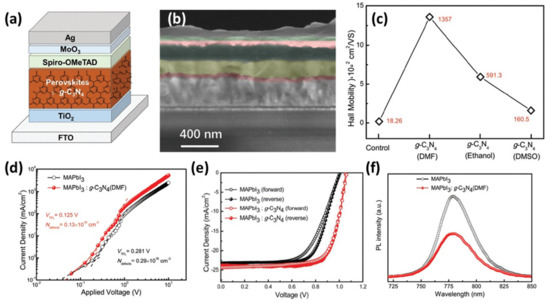 (a) Architecture of MAPbI3:g-C3N4 based n-i-p PSC and (b) corresponding cross-sectional SEM image, (c) Hall mobility of MAPbI3 and MAPbI3:g-C3N4 in various solvents films, (d) current density–voltage (J–V) curves of hole-dominated devices with a structure of FTO/PEDOT:PSS/MAPbI3 (with and without g-C3N4)/MoO3/Ag, (e) J–V curves of MAPbI3 and MAPbI3:g-C3N4 based devices by forward and reverse scan, and (f) photoluminescence (PL) spectra of MAPbI3 and MAPbI3:g-C3N4 (DMF) films deposited on TiO2/FTO. Reproduced with permission from [56], Copyright 2017, Wiley-VCH GmbH.