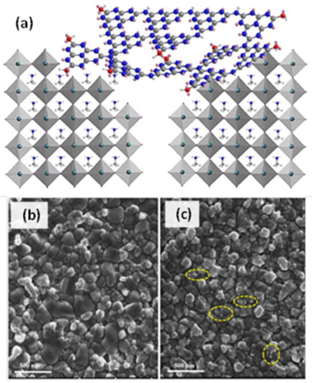 (a) Schematic illustration of the self-location process of E-g-C3N4 at MAPbI3 grain boundaries by hydrogen bonding interaction. (b,c) Top-view FESEM images of MAPbI3 film and E-g-C3N4 modified MAPbI3 film, respectively. Reproduced with permission from [97], Copyright 2019, Elsevier.