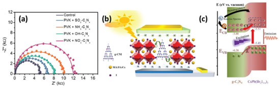 (a) Nyquist plot of control and devices passivated by functionalized C3N4. Reproduced with permission from [99], Copyright 2019, Wiley-VCH GmbH. (b) Schematic diagram of the mechanism of g-CNI modified PSCs. Reproduced with permission from [100], Copyright 2019, The Royal Society of Chemistry. (c) Schematic illustration of charge transfer between CsPb(BrxI1−x)3 nanocrystals and g-C3N4. Reproduced with permission from [101], Copyright 2020, Wiley-VCH GmbH.