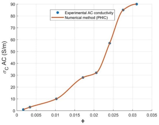 Power-law percolation theory is generally used to predict the electrical conductivity above the critical concentration volume of the reinforcement, as illustrated by Equation (3). A numerical method is considered as an extensive reference, offering hundreds of useful and important algorithms that can be implemented into MATLAB for a graphical interpretation of conductivity at the studied range of CNT volume loading [27]. For our present study, piecewise cubic hermit interpolating polynomial (PCHIP) [28] has been used in order to predict the electrical conductivity, showing a perfect agreement with experimental values. PCHIP is a polynomial of three degrees in the interval comprising (0.17–0.31 vol.% CNT), as shown by Equation (4) and plotted in Figure 2, where , a, b, c and d are parameters fixed by the PCHIP algorithm. The degree of the PCHIP polynomial may be referred to the creation of a three-dimensional system. PCHIP graph is superposed perfectly on the AC conductivity curve with a fitting error of R2 = 1; from this result, we can present PCHIP as an effective way to predict the electrical conductivity at the whole range of CNTs loading.