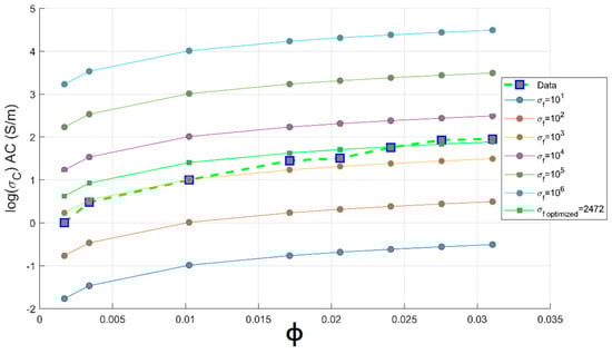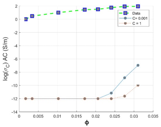 The model presented by Equation (18) is able to predict the AC electrical conductivity with a fitting error equal to . Additionally, the effect of varying the surface to volume ratio has been studied. As shown in Figure 14, it can be concluded that our proposed model based on hyperparameter optimization using MSE method is highly verified at a surface to volume ratio , since carbon nanotubes in PC matrix have maintained their surface to volume ratio supporting the feasibility of our melt blending procedure. For the simplest viewpoint, the optimized value of the geometric factor is obtained from our extensive algorithm, as expressed in Equation (18); its value C is ranging from 0.001 to 1 as depicted in Figure 15. Sohi model extension may be written as follows: