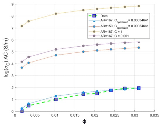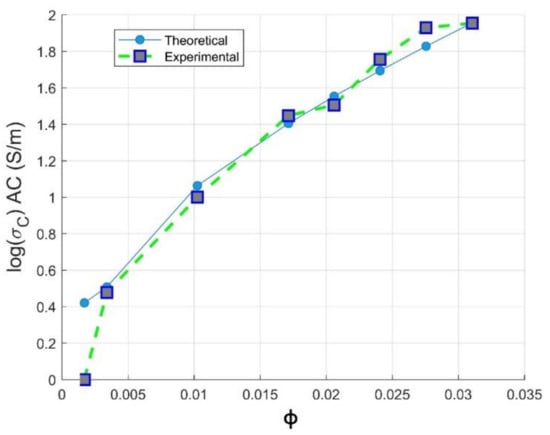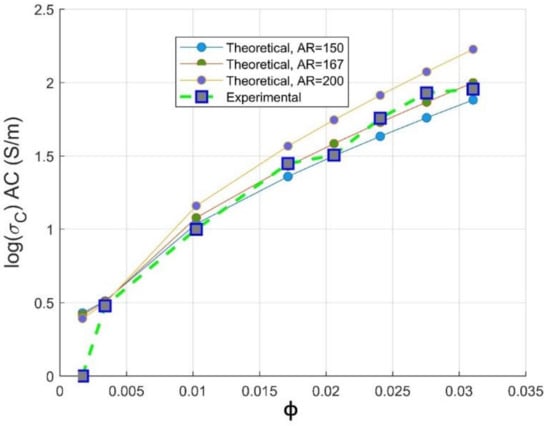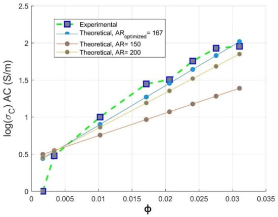 Meanwhile, for an optimized value of aspect ratio maximum volume, fraction F of the CNT is equivalent to the weight CNTs fraction used to reach optimal electromagnetic absorption index [14], as also depicted in Section 3.3. From Figure 8, we can conclude that the way of preparation of PC/CNT samples is efficient according to the perfect match of the theoretical electrical conductivity at an aspect ratio ranging from , proving that our operational extrusion conditions have not altered CNTs chain network. For the optimized aspect ratio the value of the fitting error is R2 = 0.967 implying the feasibility of our presented model as presented in Equation (13) to predict the AC electrical conductivity.