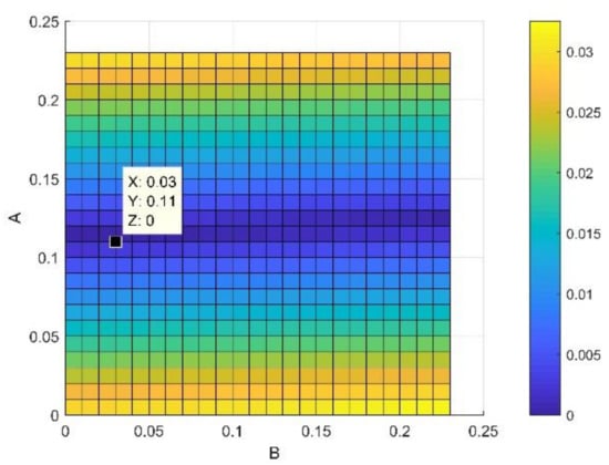 Our approach is based on the integration of Equations (12), (14) and (15) in the fundamental model of Mamunya as a predictive tool for the electrical conductivity. The goal of our strategy is to model the exponent factor k as a function of the surface energy of the composite, the filling charge and the critical volume fraction for percolation; as its value is reported not to be a universal value and can be adjusted in order to have the same superposition, as Equation (13) shows in [11]. By means of the multiple grid-search hyperparameters optimization, the value of MSE is minimized and the value of the squared fit error R2 is maximized, thus approaching the same fit error, obtained from Equation (14), as shown in a comparative performance of the coefficient of fitting R2 between the two Mamunya algorithms from Figure 9a,b presenting k as an independent exponent factor on one hand (Equation (10)), and in another hand, as a parameter function of various factors, as shown from the integration of Equations (14) and (15) into the Mamunya model. The optimal values of A and B obtained from a series of an hyperparameter optimizations are found to be 0.11 and 0.03 respectively, as shown in Figure 10 depicted by the black mark, resulting in low mean square error value (), hence approaching at this optimized values the experimental electrical conductivity; at these values of A and B, it is resulted a linear behavior of electrical conductivity as obtained in Figure 8 approaching by this result the same coefficient of determination R2 as obtained from Equation (13). A and B are generally defined for composites with different polymer matrices charged by a unique nanofiller; in our case, by using a hyperparameter optimization and MSE method for a composite formed by a single polymer matrix. These values do not largely differ from the ones obtained from an experimental approach [46]. The respective values of exponent’s k factors are then recorded in Figure 11. For an optimized design, an extensive Mamunya model can be written as: