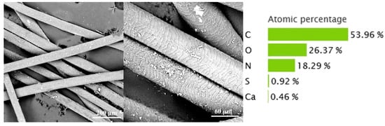 The cow hair waste retained a relatively intact scale layer. After washing, Na2S and other reagents can be successfully removed. The C, N, and O elements are 53.96%, 18.29%, and 26.37% (Figure 1), respectively. The high C content is positive for preparing biochar. In addition, small amounts of S (0.92%) and Ca (0.46%) were detected in the cow hair, which are due to the presence of disulfide bonds in the keratin and the use of lime in the liming process, respectively.