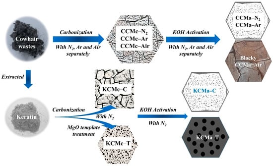 The flowchart of biochar preparation is described in Figure 2. Cow hair waste and keratin extracted from the waste were used for preparing biochars. The CCMcs (CCMc–N2, CCMc–Ar, and CCMc–Air) were obtained by carbonization at 350–600 °C with N2, Ar, and air, separately. After the KOH activation, the CCMa–N2 and CCMa–Ar with a similar bread-like structure were obtained, and CCMa–Air has blocky nanostructures. In addition, the keratin was extracted from cow hairs by NaOH and WB600 enzymes. The keratin-based biochars were prepared with an MgO pretreatment in an N2 atmosphere. The simple carbonization causes the compacted structure of KCMa–C, whereas the MgO template treatment endows the KCMa–T with an orderly porous sponge structure.