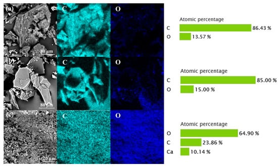 Cow-hair-based biochars carbonized in N2, Ar, and air were observed and analyzed and the results are shown in Figure 3. It shows that the elemental composition of CCMa–N2 and CCMa–Ar are similar and include C and O. The C content of CCMa–N2 and CCMa–Ar is 86.43% and 85%, respectively, along with significant O-doping. The CCMa–Air includes high content of O (64.9%) and Ca (10.14%). It is known that hair waste usually contains some lime due to the dehair-liming process in leather production. Some CaCO3 is produced with the presence of O2 in air in carbonization, and it is difficult to fully remove it by HCl washing in KOH activation [].