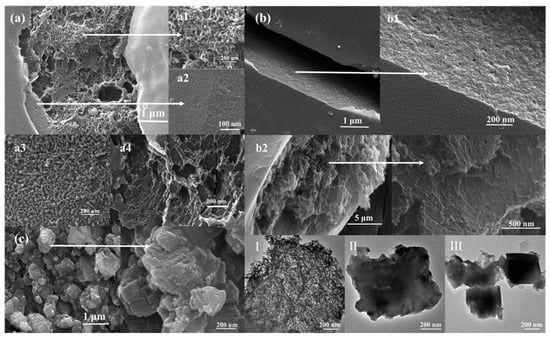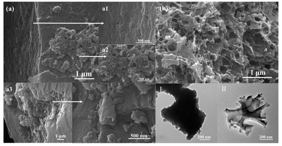 The KCMa–C is blocky with a large scale (Figure 5(a1)), and the KOH activation produces a number of pores in the surface (Figure 5(a2)). By the hydrolysis of hair to extract keratin, polypeptide chains with different molecular weights are generated, forming different scales of block structures (Figure 5(a3)). Obviously, the MgO template method leads to an orderly sponge structure (Figure 5b). After pyrolysis, MgO is removed, and the originally occupied position forms the mesoporous structure. In the TEM spectra (Figure 5I,II), the structure of KCMa–C is more compacted (Figure 5I). A number of mesopores appear by the MgO template method in KCMa–T (Figure 5II).