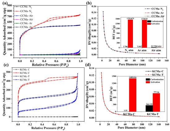 The N2 adsorption–desorption isotherms and the corresponding pore size distribution curves of biochars, which were prepared under different atmospheres, were used to analyze the porous structure and specific surface area. In Figure 6, similar type IV absorption and desorption isotherms along with an H4 hysteresis curve [] appear for CCMa–N2, CCMa–Ar, KCMa–C, KCMc–T, and KCMa–T. This indicates that the accumulated particles form slit pores, which produce mesoporous structures in biochar []. The specific surface area of CCMa–N2 and CCMa–Ar reaches 1753.075 and 1730.93 m2/g (Table S1), respectively, representing that the KOH activation increases the specific surface area effectively. The specific surface area of KCMa–C is 1409.016 m2/g. Though the MgO template method can make the biochar structure more orderly, the specific surface area is not improved. This is because MgO forms a large number of macroporous structures, and the increasing pore volume leads to a decrease in the specific surface area of KCMc–T (Figure 5). By observing the pore diameter distribution, the diameters of CCMs and KCMs were found to mainly be in the range of 2–20 nm, which presents the appearance of a large number of mesopores []. The unique porous structure and high specific surface area of biochar may result in an abundance of applications, such as adsorption materials [] and electrode materials [], in the future.