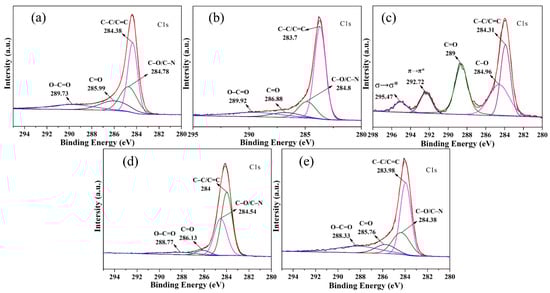 XPS spectra (C1s) of (a) CCMa–N2; (b) CCMa–Ar; (c) CCMa–Air; (d) KCMa–C and (e) KCMa–T.