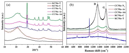 The XRD spectra of CCMs and KCMs are displayed in Figure 8a, which shows an amorphous structure. CCMa–Air has a wide diffraction peak at 21°, reflecting the presence of amorphous or disordered carbon []. In the spectra of CCMs, the diffraction peaks appear at 23 and 43°, corresponding to the (002) (parallel graphite flake accumulation) and (100) lattice planes of graphite, respectively []. This indicates the formation of sp2 hybrid carbon, which reflects that these chars contain single-layer carbon sheet structures. The wide peaks at 23 and 43° in CCMa–N2, CCMa–Ar, and CCMa–Air represent the existence of amorphous carbon. The peaks of CCM at 29.4 and 36° indicate the 110 and 111 lattice planes of carbon, respectively []. In addition, the peaks of CCM at 39.5, 47.5, 48.5, and 57.5° represent the crystal phases of the different keratin-based biochars. The diffraction peaks at 39.5, 47.5, 48.5, and 57.5 correspond to the Bragg reflection planes of 107, 206, 304, and 314, respectively []. Both KCMa–C and KCMa–T have a wide diffraction peak in the range of 20–30°. This indicates that KCMa–C and KCMa–T are disordered graphite carbon. The wide diffraction peak of KCMa–C at 44° further proves the amorphous structure [].