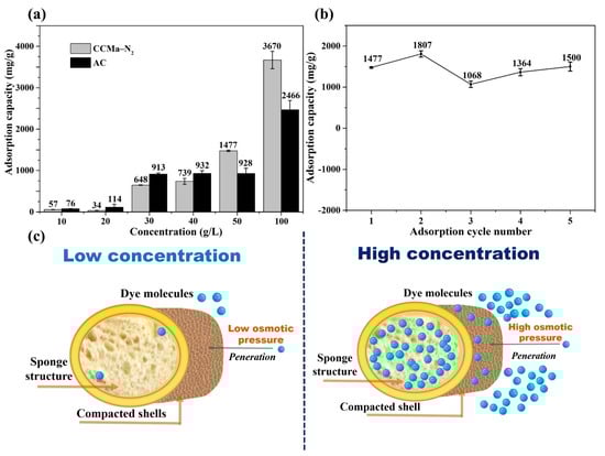 The results show that the adsorption capacity of CCMa–N2 to DB dye reaches 1477 mg/g in 50 g/L of DB solution, while the adsorption capacity of AC is 928 mg/g. Thereby, the CCMa-N2 shows a higher adsorption capacity with a high concentration of wastewater. When the DB concentration has a low concentration (below 40 g/L), the adsorption capacity is low, which should result in the special bread-like structure. The compacted shell of biochar prevents the penetration of dye molecules as shown in Figure 9c. Compared to CCMa–N2, the structure of AC is open-type, which can take the physical adsorption with the dye in wastewater sufficiently at low concentrations []. The adsorption capacity of AC can reach 932 mg/g in 40 g/L of DB solution, while that of CCMa–N2 is 739 mg/g. With the increase in the dye concentration in solution, the osmotic pressure is improved. The high driving force causes a large amount of dye molecules to penetrate through the compacted shell [], while the compacted shell prevents the spread of dye molecules in solution. Thus, the dye molecules can be adsorbed onto the surface of the compacted shell as well as in the spongy interior (Figure 9c). In the saturated solution of the DB dye, the adsorption capacity reaches 3670 mg/g (Figure 9a), which is higher than that of AC (2466 mg/g). In addition, the desorption of dye and the regeneration adsorption of biochar are significant as shown in Figure 9b. In five cycles, the absorption ability of CCMa–N2 is stable at around 1500 mg/g. In summary, the keratin-based biochars display a positive ability to adsorb dye, and they can be expected to be used for further heavy metal adsorption with a high concentration.