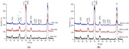 The films were deposited via spin-coating of the final solutions on Pt/TiO2/SiO2/Si substrates at 2000 rpm (30 s duration). Sol was applied to the substrate using a precision Cee® 200X centrifugal coating device (SPS-Europe B.V., Putten, The Netherlands). Sol (3 mL for 1 step) was poured onto the substrate at the same time. After this, wet layers were dried at 350 °C (4 min), and then thermally processed at 550 °C (5 min in air) by RTA (rapid thermal annealing). This was repeated 3 times to get the required thickness (≈300 nm). Such obtained layers were then annealed at 200 °C for 20 min, 400 °C for 20 min, and crystallized at 550 °C, 600 °C, 700 °C for 20 min, respectively. The average thickness of the coating per application step is 95–100 nm. Bi0.9La0.1FeO3 (BLFO) thin films were produced using analogous procedure. Lanthanum nitrate, La(NO3)3·5H2O, was then used for doping. In this case, all metal salts were dissolved separately, including La-nitrate.