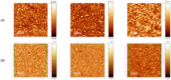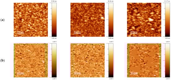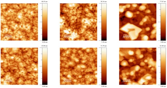 The results of the investigation of the surface morphology of the films after annealing at different temperatures are presented in Figure 2 (AFM images) and summarized in Table 2.