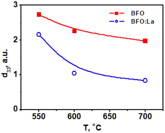 Figure 5 features a clear decrease in the piezoelectric signal with annealing temperature for both doped and undoped BFO films. In general, doped films are less piezoelectric (Figure 5) because the end member of the solid solution LaFeO3 is centrosymmetric [37].