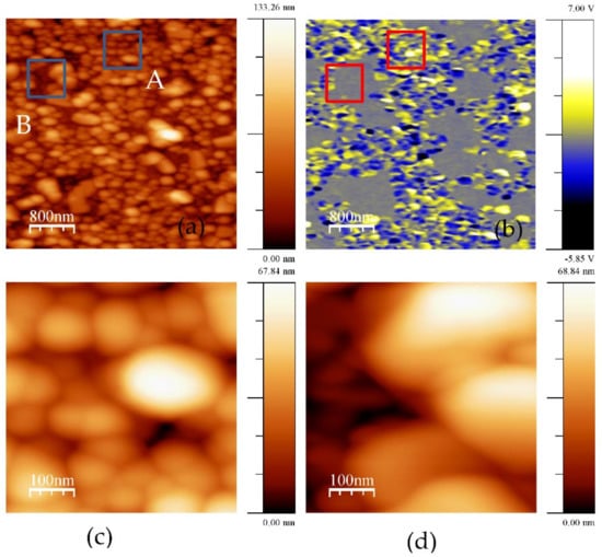 BFO film annealed at 700 °C: (a) Topography, (b) piezoresponse; and zooms of areas A (c,d) shown in Figure 7a. Estimated average grain size of A is 100 nm and B—300 nm.