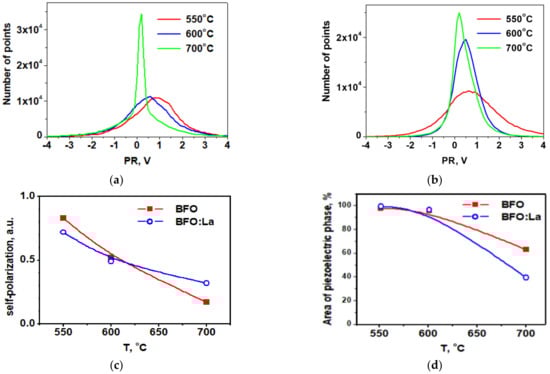 Histograms of the piezoresponse images of BFO (a) and BFO:La (b) thin films annealed at different temperatures; (c) self-polarization in BFO and BFO:La films vs. temperature; (d) evolution of areas with piezoresponse after different annealing temperatures.
