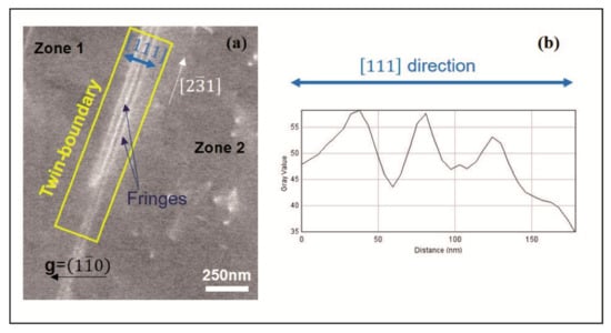 Figure 1a is an ECC micrograph of a twin-boundary already characterized by Electron BackScatter Diffraction (EBSD) [14]. It is carried out using a working distance of 7.3 mm, an acceleration voltage of 10 kV, and a pole piece mounted Backscattered Electron detector in a Zeiss Auriga electronic microscope (Zeiss SEM, Oberkochen, Germany). Briefly, the observed twin-boundary separates two grains (labeled zone 1 and zone 2) observed in the γ phase of a TiAl alloy for the diffraction condition g = (10). The surface planes of zone 1 and zone 2 are, respectively, (457) and (013). The common direction on the surface to both grains is [21]. The twin-boundary plane, which intercepts both (457) and (013) planes along direction [21], is the (111) plane. This latter is inclined of about 11° relative to the surface of observation.