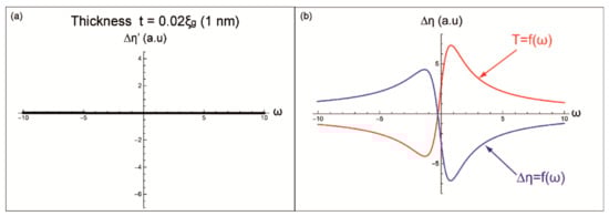 Modeled profiles of (a) Δη’(ω), (b) T(ω) and Δη(ω) for a thickness t = 0.02 ξg (1 nm).