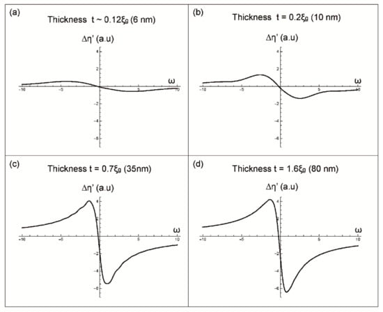 - For a thickness t = 0.2ξg (10 nm), a larges peak (for negative values of ω) and a hollow (for positive values of ω) appear (see Figure 3b). In addition, it is noted that the more the thickness increases, the more the amplitude of Δη’(ω) increases. These same observations are accentuated for the following thicknesses.