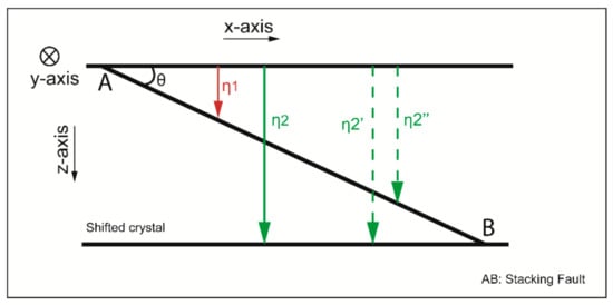 where η1 and η2 represent the BSE generated, respectively, from the perfect crystal above the stacking fault and from the shifted one as it is represented in the schematic of Figure 4: η1 and correspond to the contribution of a sample with zSF thickness on the BSE signal, represents the variation of this signal on a perfect crystal.