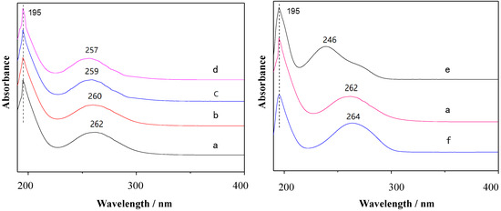 The ultraviolet spectra of 4,4′-pyridine and substituted viologens: (a) OV, (b) DeV, (c) DoV, (d) HV, (e) 4, 4′-pyridine, and (f) BV.
