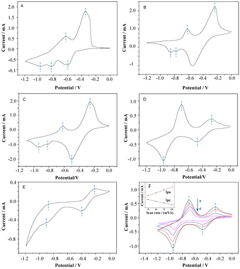Otherwise, the oxidation peaks of −0.82 V (Figure 2A,C) and −0.78 V (Figure 2B) were caused by the dimerization of viologens. However, with the increase in carbon chain length, the steric hindrance effect of the substituents increased in the same amount of time, which decreased the dimerization of the compounds, and the oxidation wave of about −0.82 V gradually decreased until it could be ignored (Figure 2D). Figure 2F shows the CVs of the HV film at different scanning potentials. With the increase in scanning rate, the oxidation potential increased while the reduction potential decreased, and the oxidation current and reduction current showed a linear relationship with the scanning rate. These results indicate that the redox events were controlled by the surface-confined electron transfer kinetics rather than the diffusion process [32,33].