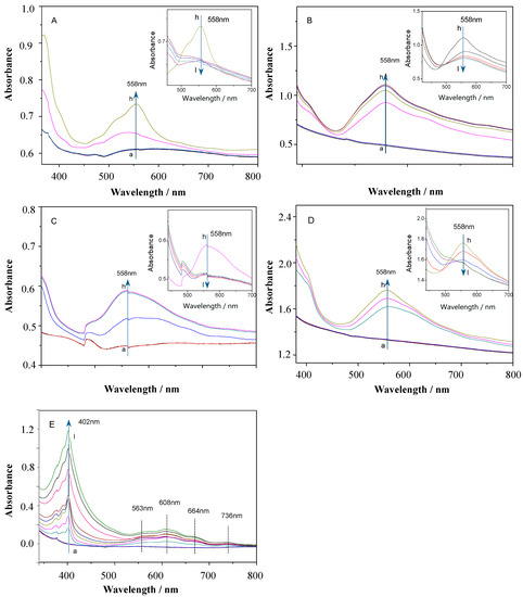 Absorption spectra of the (A) OV, (B) DeV, (C) DoV, (D) HV, and (E) BV upon applying different potentials. (a: 0, b: −0.1, c: −0.2, d: −0.3, e: −0.4, f: −0.5, g: −0.6, h: −0.7, i: −0.8, j: −0.9, k: −1.0, and l: −1.1 V).